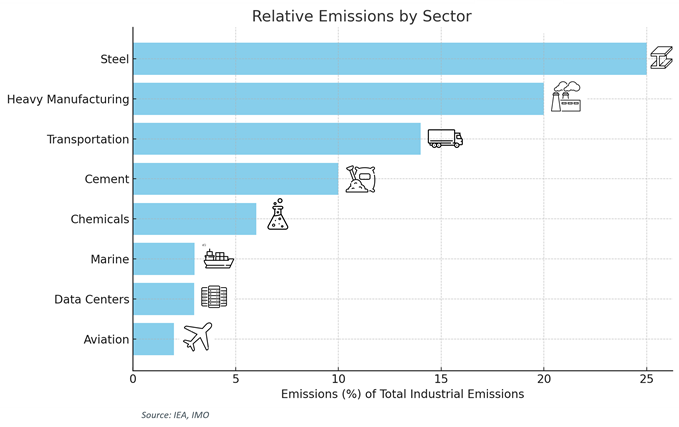 Decarbonising industries such as steel, cement, and heavy manufacturing is a monumental challenge. These sectors are responsible for around 39% of global emissions and 25% of Europe’s industrial emissions, many rely on fossil fuel-intensive processes, and need to remain competitive. The marine sector, often overlooked, is another key segment accounting for 3% of global emissions growing to 17% by 2050 on the current trajectory. With Europe committed to net-zero by 2050, these industries must undergo radical transformation. The chart below highlights the relative impact of these sectors, underscoring the need for innovation and investment to drive meaningful change.